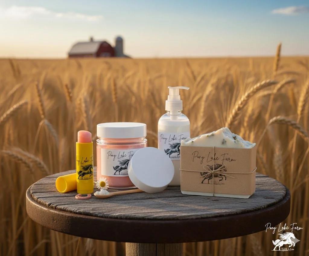 Between feeding animals and mucking stalls, you’ll find me in my little workshop, carefully blending lotions, chapsticks, shaving supplies, moisturizers, and more. Every item is made in small batches with care, created to nourish your skin the way a good Kansas sunset nourishes the soul.