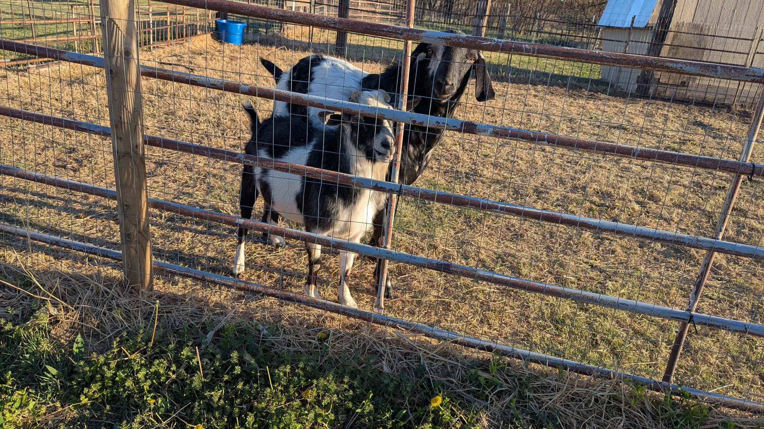 Currently, only one goat is for sale. He is the smaller of the two bucks pictured here. His name is Levi, and he is the tamest, most mild-mannered goat I own, and they are all very tame! He’s easy to handle, doctor, trim hooves, and he loves attention. He is only leaving my farm because he no longer fits in due to not being a Nubian. If you are in need of a three-year-old tame buck to get the job done, he is your man.
